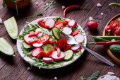 Zdjęcie "Świeże, czerwone rzodkiewki w drewniane miski wśród płyt z warzyw, zioła i przyprawy i, widok z góry, Selektywny fokus." może być wykorzystywane do celów osobistych i komercyjnych zgodnie z warunkami zakupionej licencji Royalty-free. Obraz jest dostępny do pobrania w jakości wysokiej rozdzielczości do 5760x3840.