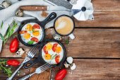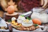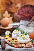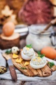 Jaja faszerowane pasztet kremowy śledzia na drewniane rustykalne zadumany