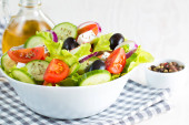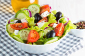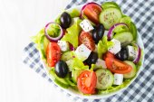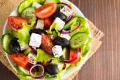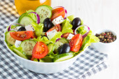 Zdjęcie "Świeża sałatka grecka z pomidorów cherry, ruccola, Rukola, feta, oliwki, ogórkami, cebulą i przyprawami. Sałatka Cezar w misce biały na tle drewnianych. Zdrowe diety ekologicznej żywności koncepcji." może być wykorzystywane do celów osobistych i komercyjnych zgodnie z warunkami zakupionej licencji Royalty-free. Obraz jest dostępny do pobrania w jakości wysokiej rozdzielczości do 5760x3840.