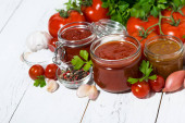 sosy pomidorowe, makaron i świeżych składników na biały drewniany stół
