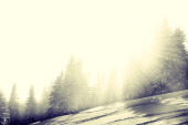 Krajobraz Fotografia mgły w zimowym lesie. Stonowanych zdjęcie