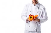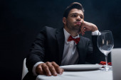 portret przystojny kelner w komplet kamizelka z pustą tacą na białym tle