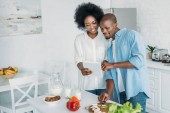 Afryki amerykański człowiek ogląda żona gotowania śniadanie w kuchni w domu
