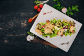 Sałatka Cezar z łososiem. Widok z góry. Na tle drewnianych. Miejsce.