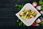 Zdjęcie "Sałatka Cezar z łososiem. Widok z góry. Na tle drewnianych. Miejsce." może być wykorzystywane do celów osobistych i komercyjnych zgodnie z warunkami zakupionej licencji Royalty-free. Obraz jest dostępny do pobrania w jakości wysokiej rozdzielczości do 5760x3840.