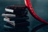Zdjęcie "Zbliżenie na stosie kawałki czekolady i syrop czekoladowy na czarnym tle." może być wykorzystywane do celów osobistych i komercyjnych zgodnie z warunkami zakupionej licencji Royalty-free. Obraz jest dostępny do pobrania w jakości wysokiej rozdzielczości do 5760x3840.