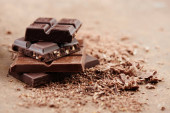 Zbliżenie na stosie kawałki czekolady i syrop czekoladowy na czarnym tle.