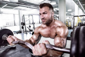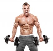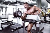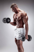 Kulturysta muskularny facet robi ćwiczenia z hantle