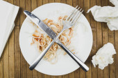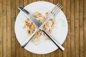 Frytki z sosem na talerzu biały, widelec i nóż. Domowe obiad, fast foodów.