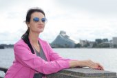 Uśmiechnięty, dopasowanie i pewna siebie Kobieta w żółta Bawełniana koszula i ciemno niebieskie Spodnie z czapką w jej ręce, stojąc przez latarnię morską z góry niewyraźne jako tło.