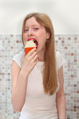 Młoda kobieta z warzyw surowych Brokuł wewnątrz usta