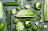 Tło żywności. Zielone warzywa i owoce na drewnianym stole