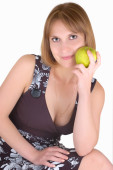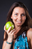 Piękna młoda redhead kobieta uśmiechając się trzyma jabłko