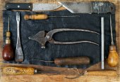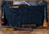 obraz Martwa natura z papieru, szczotek i innych narzędzi na podłoże drewniane