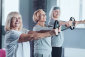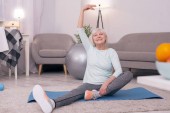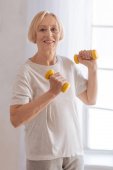 Szczęśliwy starszą kobietę, ćwiczenia z hantlami niebieski