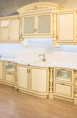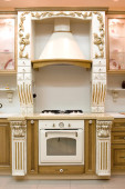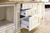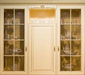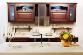 Wnętrze nowoczesna kuchnia z elegancka zastawa stołowa w szafie