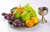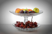 Srebrna miska owocowa przez okno w świetle dziennym.