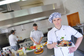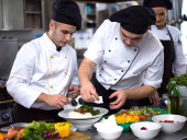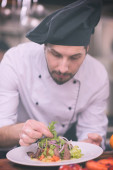 Chef wykończenie stek płyta mięsna z Wreszcie opatrunek naczyniowy i prawie gotowy do służby przy stole