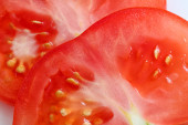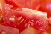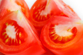 Świeżych pomidorów pokrojone na białym tle. Sałatka wegetariańska. Jedzenie zdrowej diety. Zbliżenie. Widok z boku