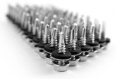 Stalowe mocowania śruby z podkładki i nakrętki, położył się obok siebie na jasnoszarym tle z odbicia.