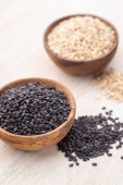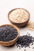 Czarny, biały i prażone ziarna sezamu na małe drewniane łyżki, sfotografowany napowietrznych na drewno z naturalnym oświetleniem (Selektywny fokus, fokus na nasiona na górze)