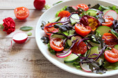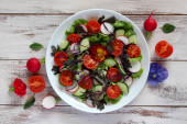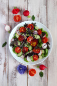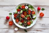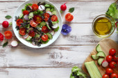 Sałatka z świeżych warzyw: pomidor, sałata, ogórek i surowe na jasnym tle. Widok z góry z miejsca kopiowania.
