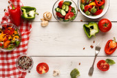 Sałatka z świeżych warzyw: pomidor, sałata, ogórek i surowe na jasnym tle. Widok z góry z miejsca kopiowania.