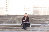 Zdjęcie "Pracownik biurowy w garnitur, siedząc na przystanku autobusowym i czytanie dokumentów. Stylowe biznesmen w jego okulary i dokumentów w jego ręce siedzi na ławce" może być wykorzystywane do celów osobistych i komercyjnych zgodnie z warunkami zakupionej licencji Royalty-free. Obraz jest dostępny do pobrania w jakości wysokiej rozdzielczości do 5760x3840.