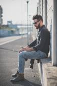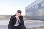 młody biznesmen płacz opuszczonego stracił w depresji, siedzący na ziemi ulicy schody betonowe emocjonalny ból, smutek, cierpienie poszukuje chorych w nieczysty oświetlenie