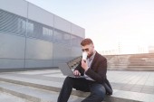 zajęty człowiek działa na laptopie w plenerze. Biznesmen siedzi na schodach i używa laptopa. Praca na komputerze na ulicy. Koncepcja biznesowa.