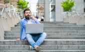 Zdjęcie "Zajęty człowiek działa laptopa na ulicy i pije kawę. Biznes człowiek siedzi na zewnątrz i działa na laptopie. Koncepcja biznesowa termin." może być wykorzystywane do celów osobistych i komercyjnych zgodnie z warunkami zakupionej licencji Royalty-free. Obraz jest dostępny do pobrania w jakości wysokiej rozdzielczości do 5760x3840.