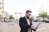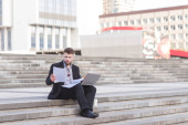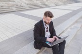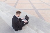 Zajęty człowiek siedzący na schodach i pracę na laptopie. Pracy na ulicy. Termin. Koncepcja biznesowa