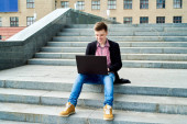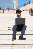 Zdjęcie "Zajęty człowiek siedzi na świeżym powietrzu z laptopa i Kanapki w jego ręce i patrzy na zegar. Koncepcja biznesowa. Zajęty człowiek pracuje się na ulicę w tle krajobrazu miasta" może być wykorzystywane do celów osobistych i komercyjnych zgodnie z warunkami zakupionej licencji Royalty-free. Obraz jest dostępny do pobrania w jakości wysokiej rozdzielczości do 5760x3840.