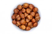 Orzechy pistacjowe pistacji z góry miska na białym tle