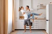 Zdjęcie "Szczęśliwa para taniec w kuchni" może być wykorzystywane do celów osobistych i komercyjnych zgodnie z warunkami zakupionej licencji Royalty-free. Obraz jest dostępny do pobrania w jakości wysokiej rozdzielczości do 5760x3840.