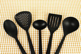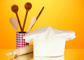 Kucharski kapelusik z łyżki i ostrze na pomarańczowym tle