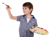 mały chłopiec malarstwo farby obraz na sztalugach na białym tle
