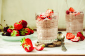 Zdjęcie "Zbliżenie: słodki świeży posiłek truskawka w miskach z kwiatów piękny czerwony tulipan na szarym tle. Widok z góry, Selektywny fokus " może być wykorzystywane do celów osobistych i komercyjnych zgodnie z warunkami zakupionej licencji Royalty-free. Obraz jest dostępny do pobrania w jakości wysokiej rozdzielczości do 5760x3840.