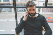 Zdjęcie "Młody Brodaty mężczyzna siedzący w kawiarni z słuchawki. Mężczyzn, trzymając się za ręce smartphone i słuchanie muzyki cyfrowej. Człowiek, robiąc notatki o książki pamiętać i laptopa. Poziomej. Niewyraźne tło." może być wykorzystywane do celów osobistych i komercyjnych zgodnie z warunkami zakupionej licencji Royalty-free. Obraz jest dostępny do pobrania w jakości wysokiej rozdzielczości do 5760x3840.