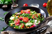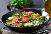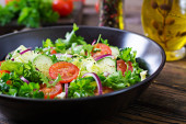 Zdjęcie "Sałatka z pomidorów, ogórka, cebuli i sałata liści. Witamina zdrowy lato menu. Wegańskie jedzenie warzyw. Stoły obiadowe wegetariańskie." może być wykorzystywane do celów osobistych i komercyjnych zgodnie z warunkami zakupionej licencji Royalty-free. Obraz jest dostępny do pobrania w jakości wysokiej rozdzielczości do 5760x3840.