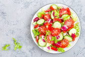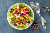 Zdjęcie "Sałatka z mięsa kurczaka. Sałatką ze świeżych warzyw z piersi kurczaka. Sałatka mięsna z filet z kurczaka i warzyw na talerzu" może być wykorzystywane do celów osobistych i komercyjnych zgodnie z warunkami zakupionej licencji Royalty-free. Obraz jest dostępny do pobrania w jakości wysokiej rozdzielczości do 5760x3840.