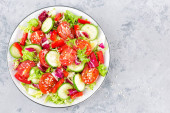 Zdjęcie "Sałatka jarzynowa. Świeże sałatki z warzyw i orzechów. Sałatka warzywna na talerzu. Żywność wegetariańska zdrowy" może być wykorzystywane do celów osobistych i komercyjnych zgodnie z warunkami zakupionej licencji Royalty-free. Obraz jest dostępny do pobrania w jakości wysokiej rozdzielczości do 5760x3840.