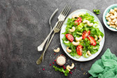 Zdjęcie "Sałatka jarzynowa. Świeże sałatki z warzyw i orzechów. Sałatka warzywna na talerzu. Żywność wegetariańska zdrowy" może być wykorzystywane do celów osobistych i komercyjnych zgodnie z warunkami zakupionej licencji Royalty-free. Obraz jest dostępny do pobrania w jakości wysokiej rozdzielczości do 5760x3840.
