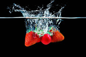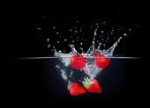 Widok ruchu dojrzałych truskawek wpadnięciem do wody na czarnym tle z bliska