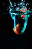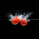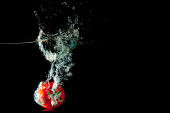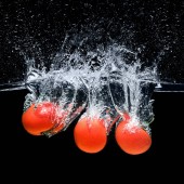 zbliżenie pomidor wpadnięciem do wody z plamy na czarnym tle