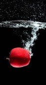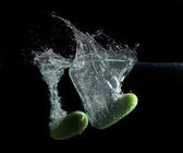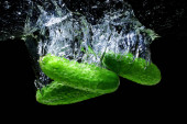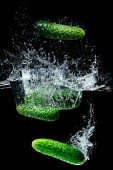 zbliżenie, dojrzałe ogórki wpadnięciem do wody z plamy na czarnym tle