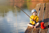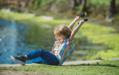 Mały chłopiec grać w parku, w pobliżu wody