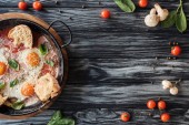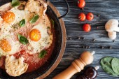 wyśmienity smażone jajka z sera, chleba i świeżych warzyw z pieprzu na drewnianym stole