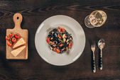 Widok góry wykwintne włoskie pierożki z ricotta na talerz i widelec z nożem na drewnianym stole