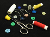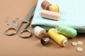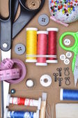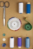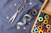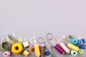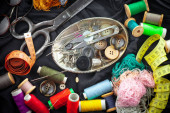 wiele nici w różnych kolorach, tkaniny, krawiec, nożyczki, guziki, igły. Akcesoria do szycia są określone w ramce.